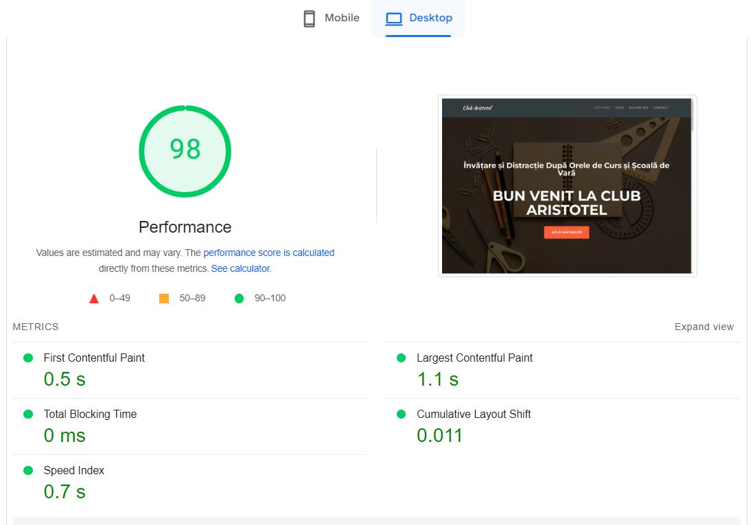 Page speed Insights - este un instrument incredibil și esential pentru optimizarea timpiilor de incarcare a paginii si analizarea elementelor care pot fi imbunatatite din punctul de vedere al performaței.